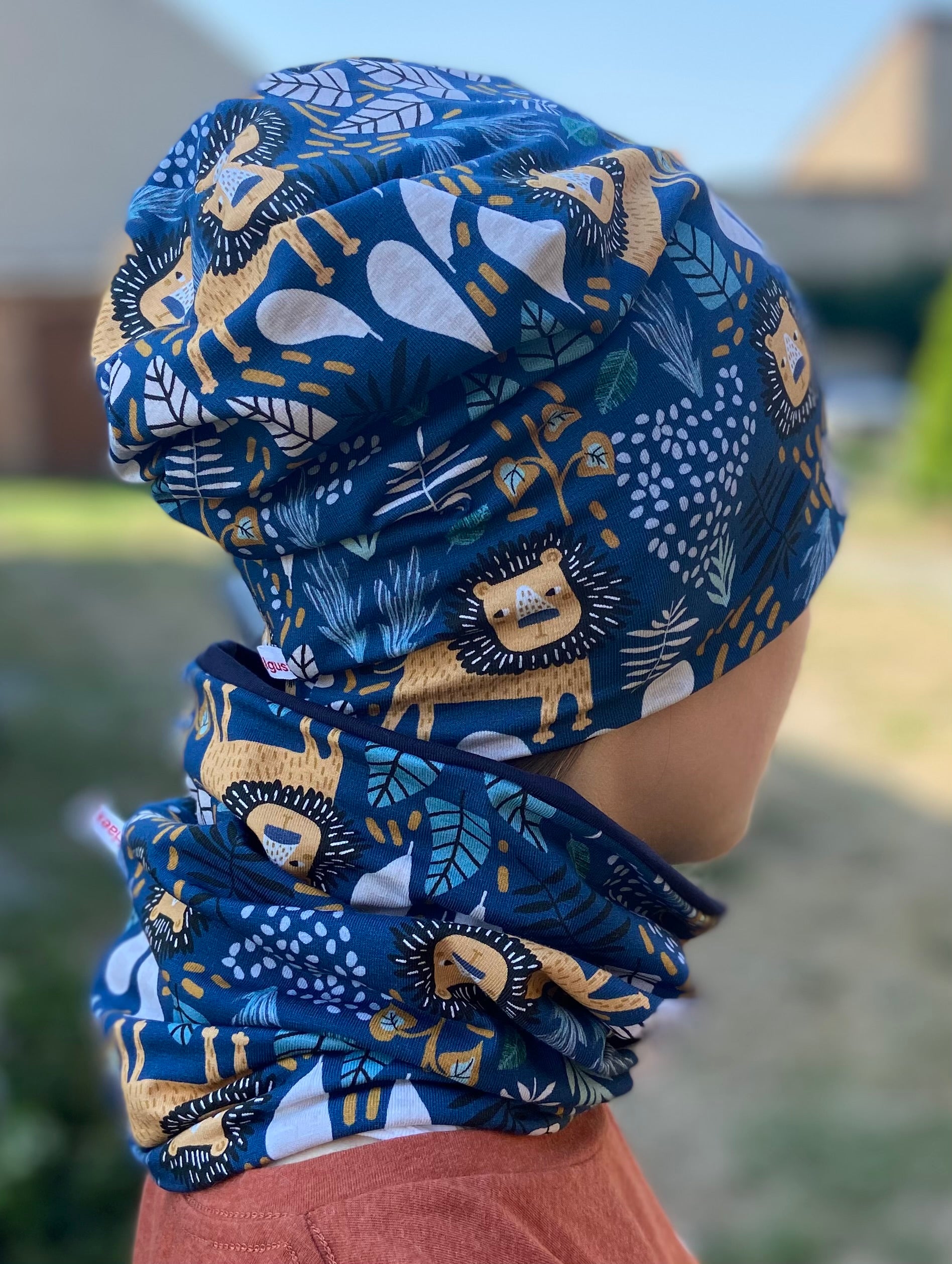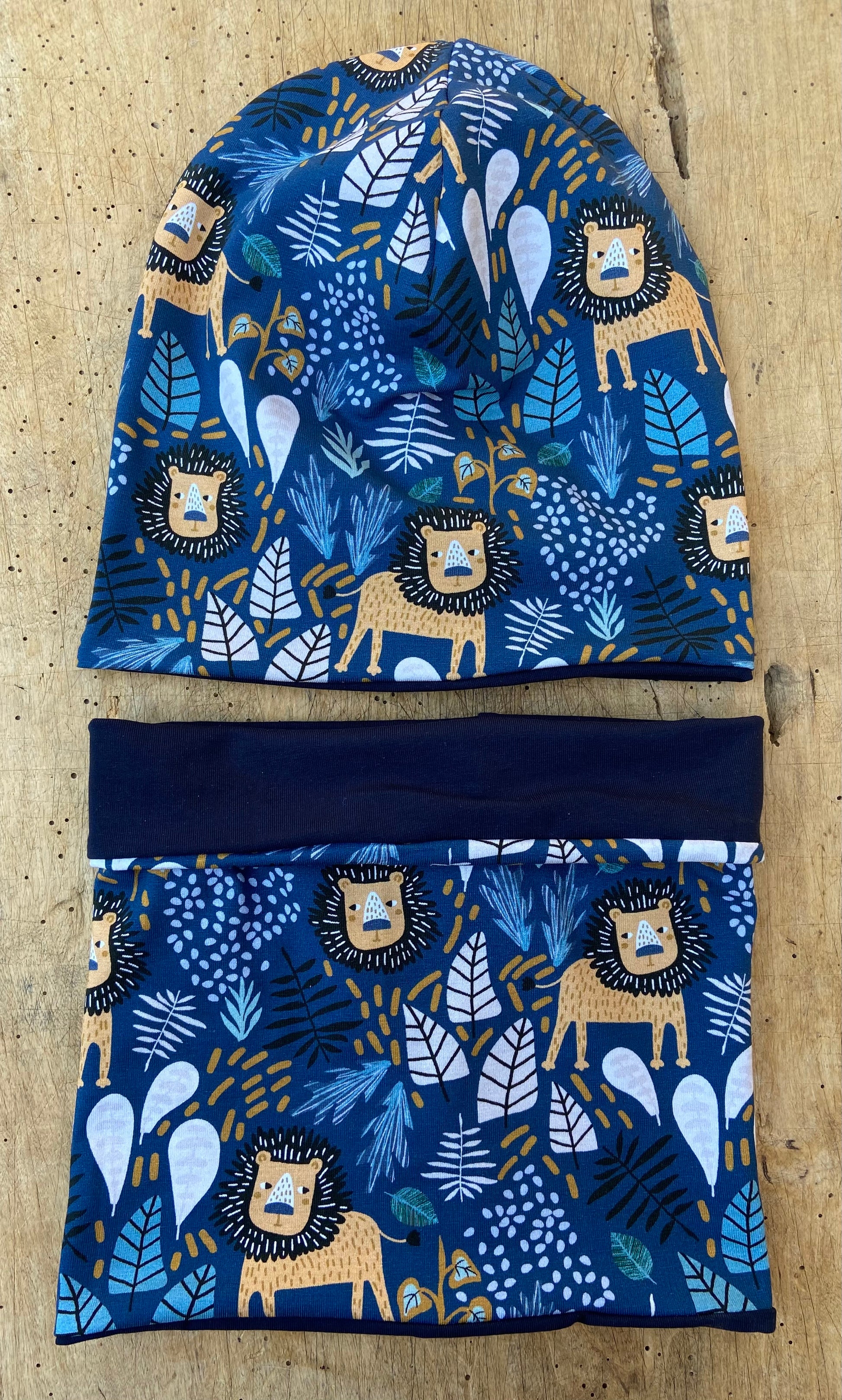 Beanie Set, Mütze Löwe, Loop, dunkelblau, Mütze Tiere, Mütze Junge, Mütze gefüttert