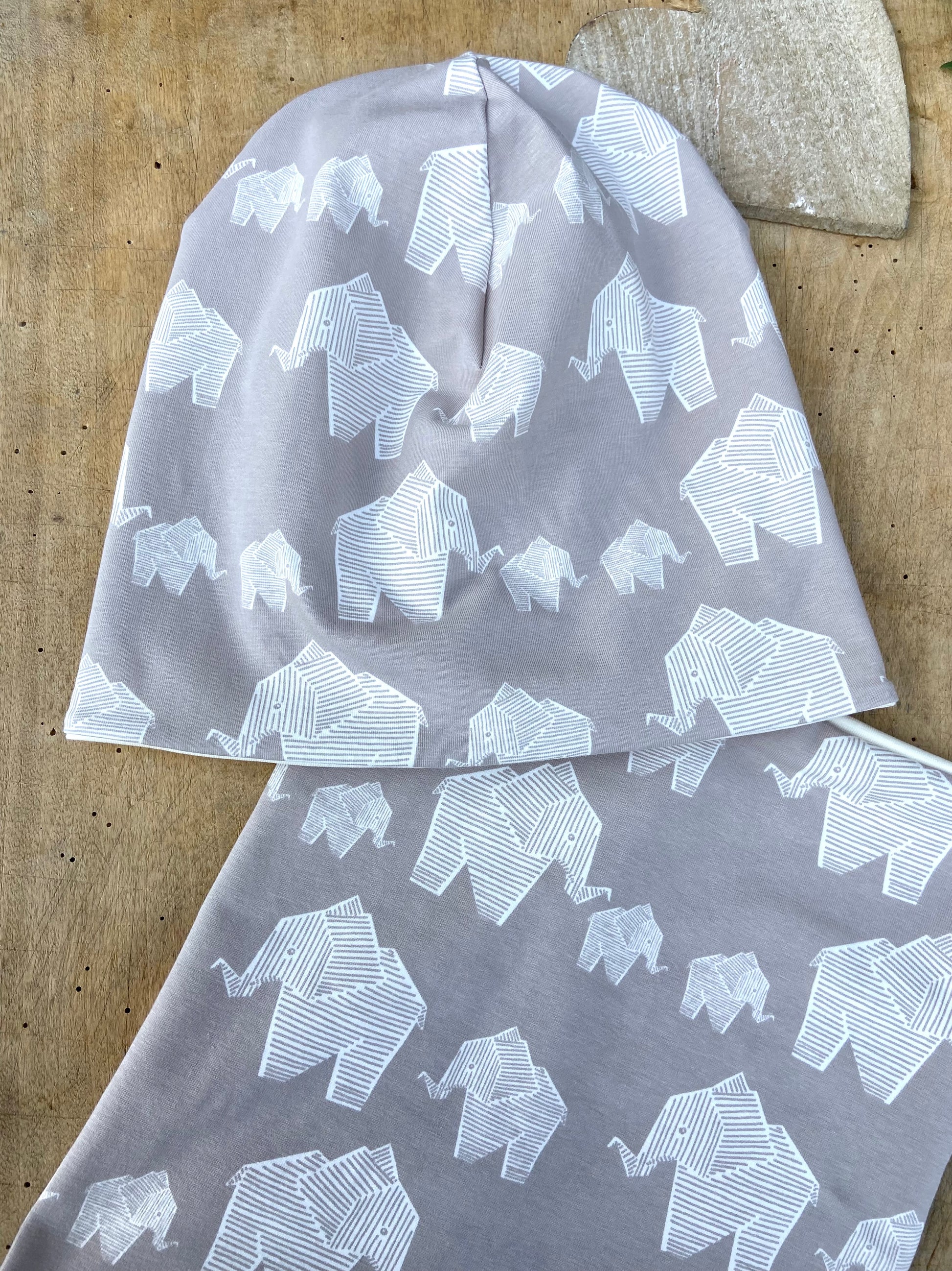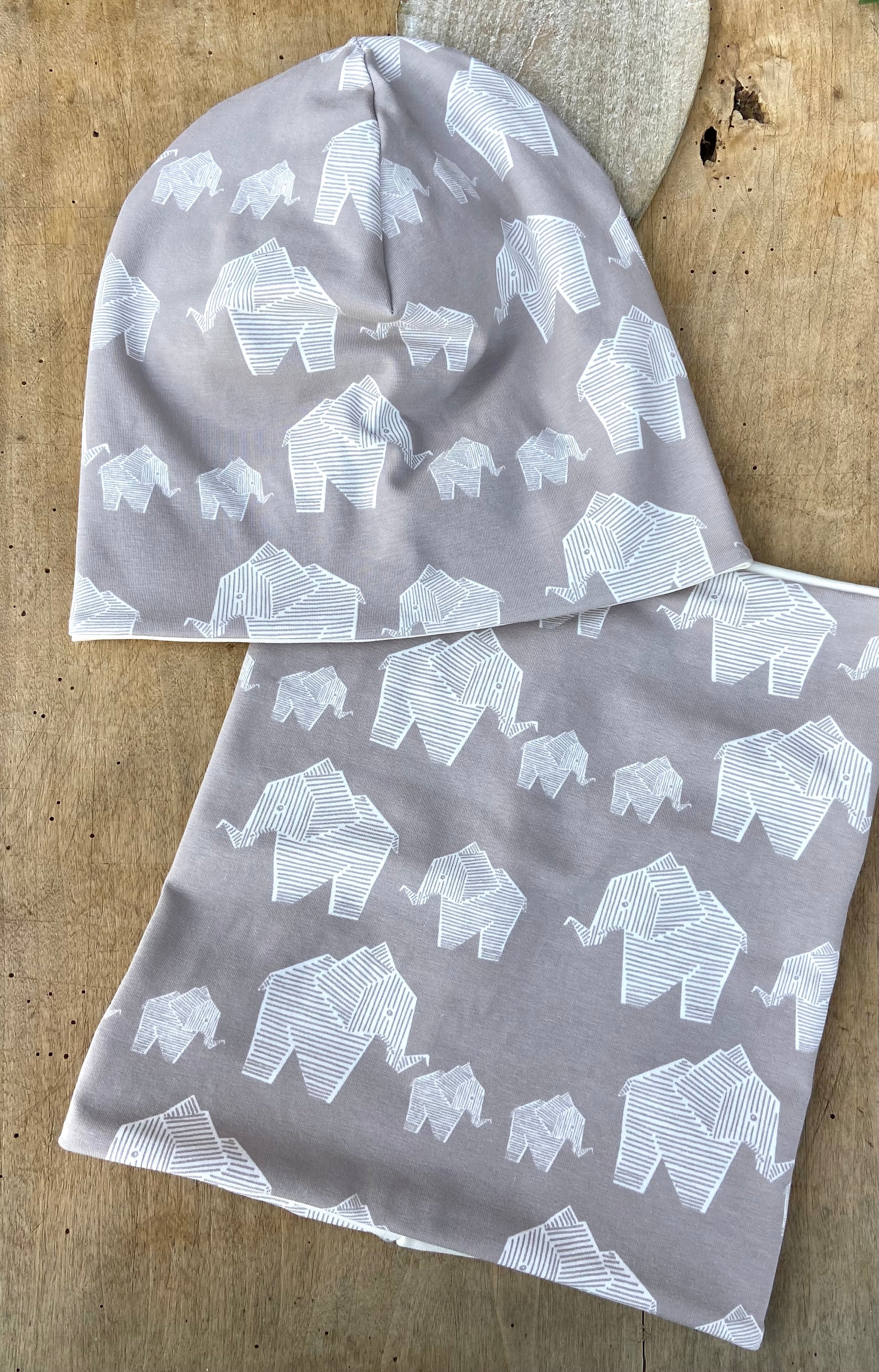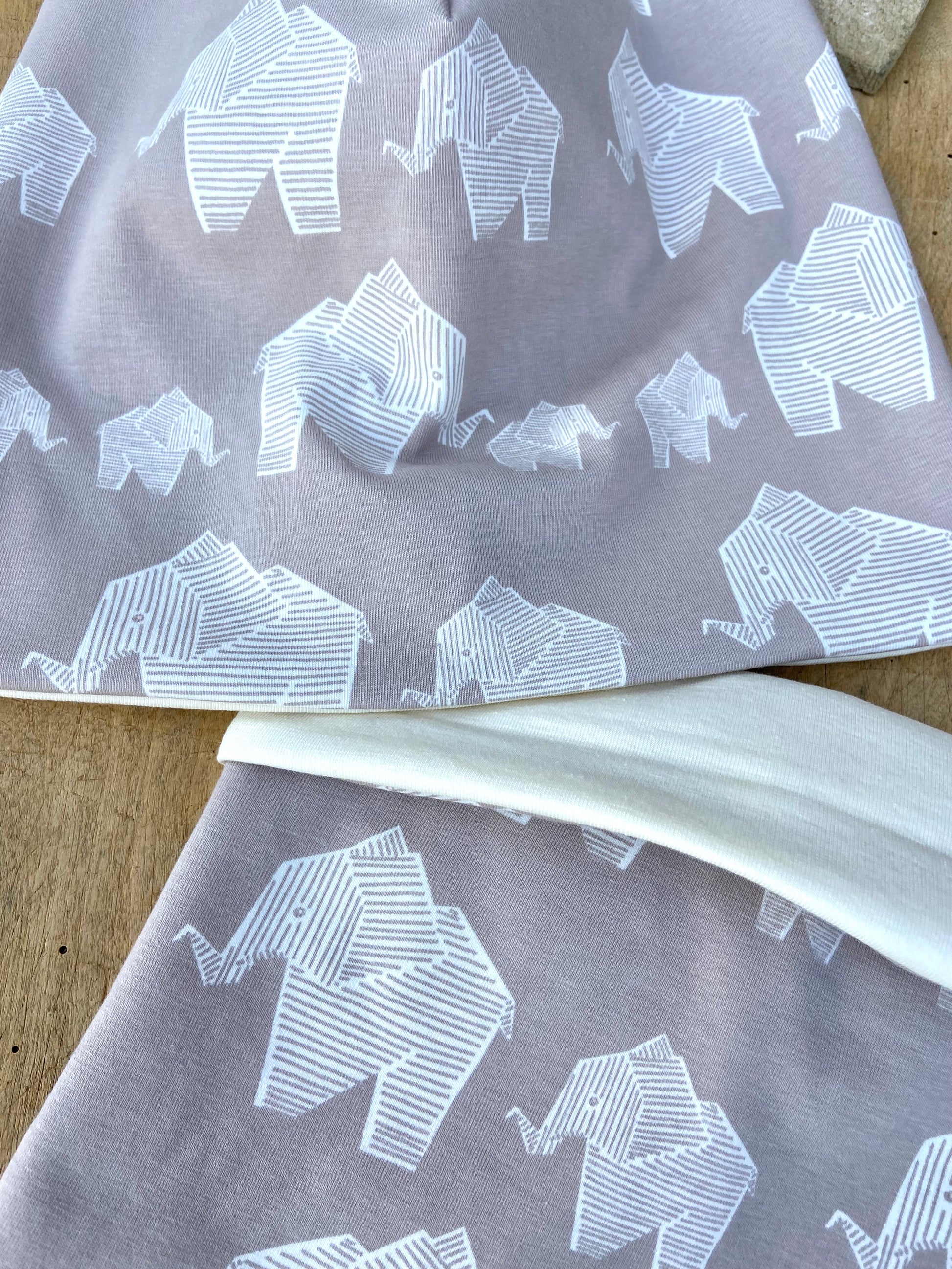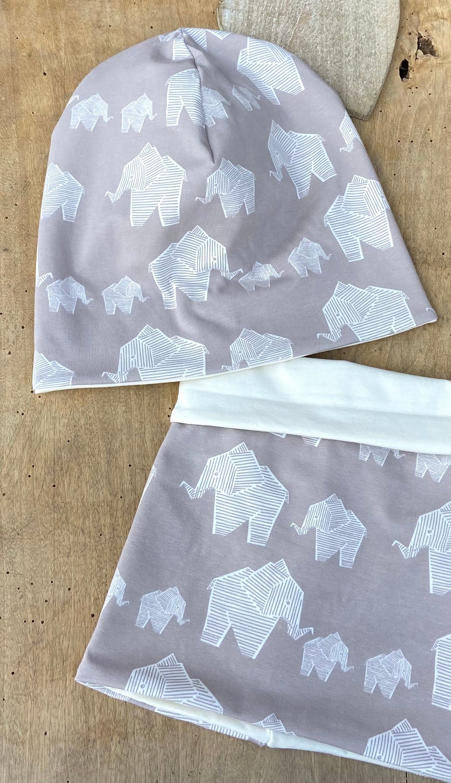 Bio Beanie + Loop Elefant creme beige unisex Übergang Set doppellagig