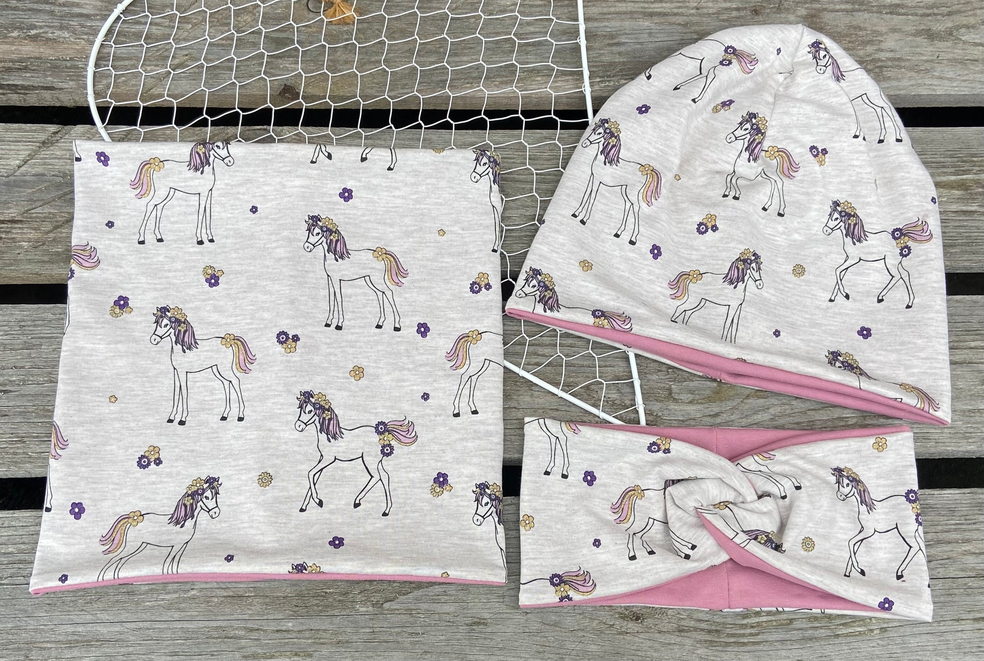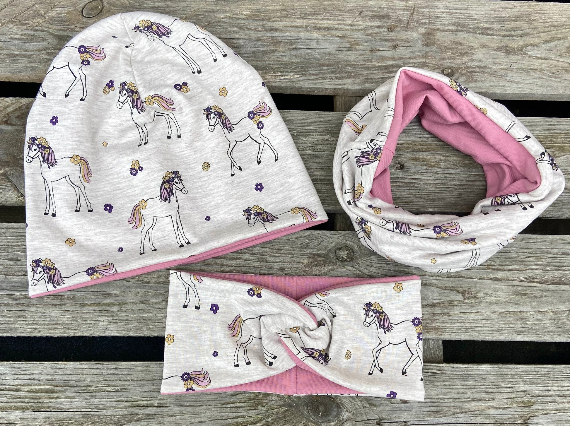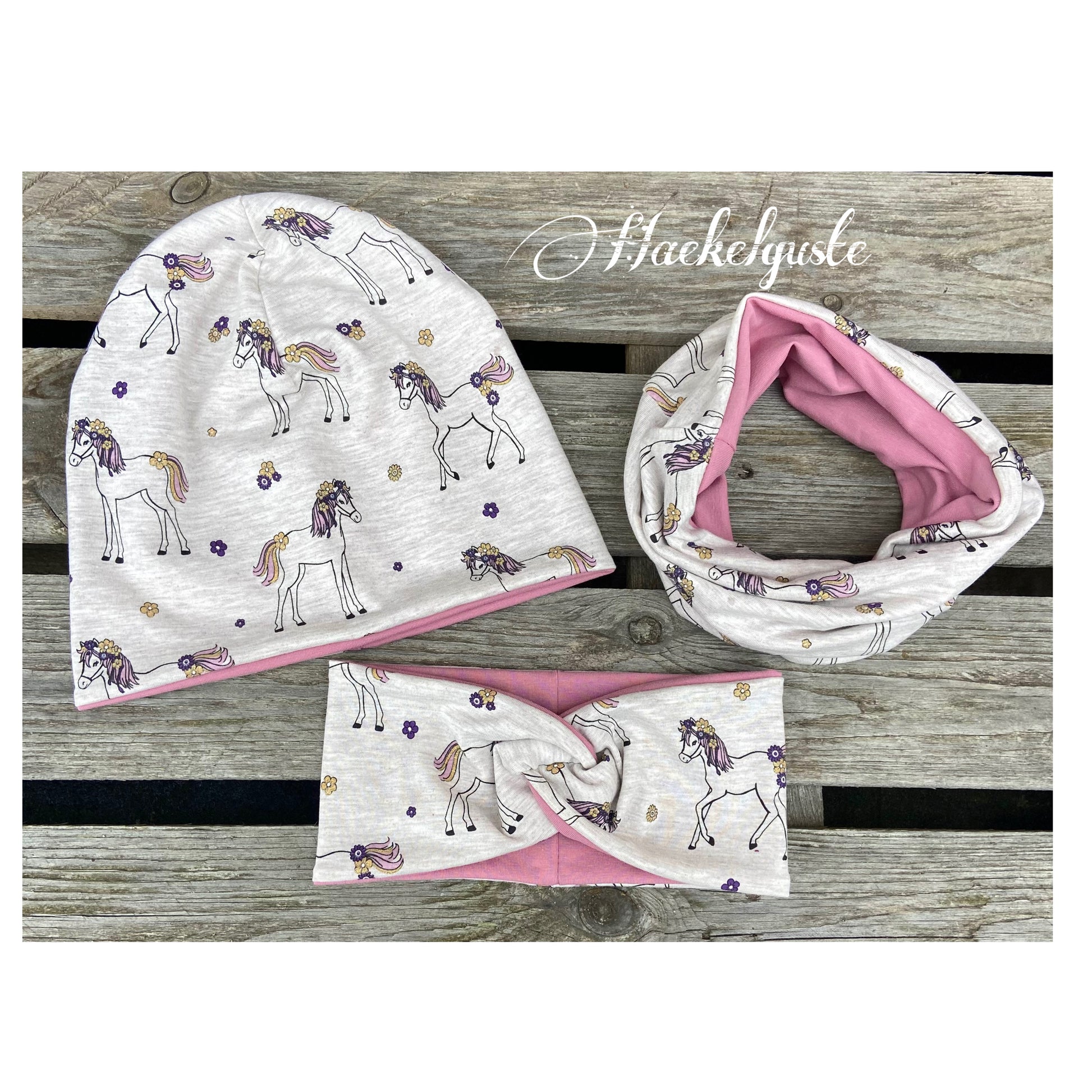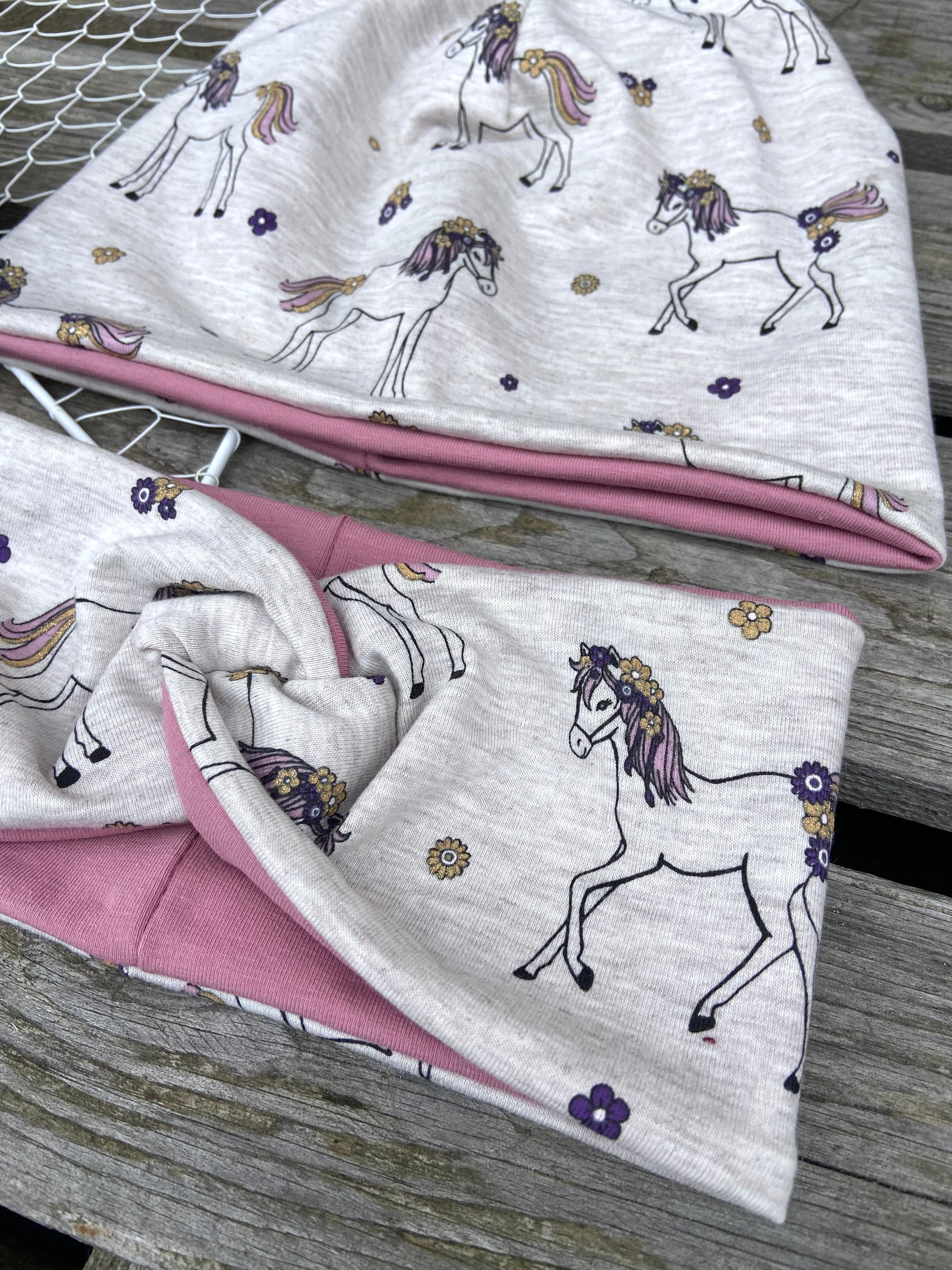 Mit viel Herz und Freude werden diese kleinen Mützen , Loop´s und Stirnbänder aus weichem hochwertigem Jersey mit Pferd und GlitzerblümchenMotiv in gewünschter Größe angefertigt.