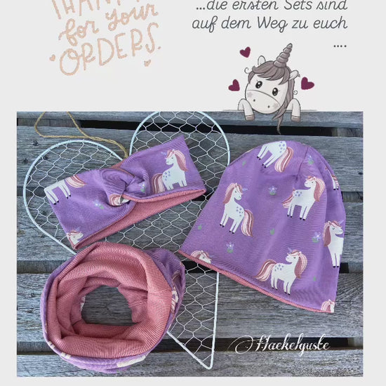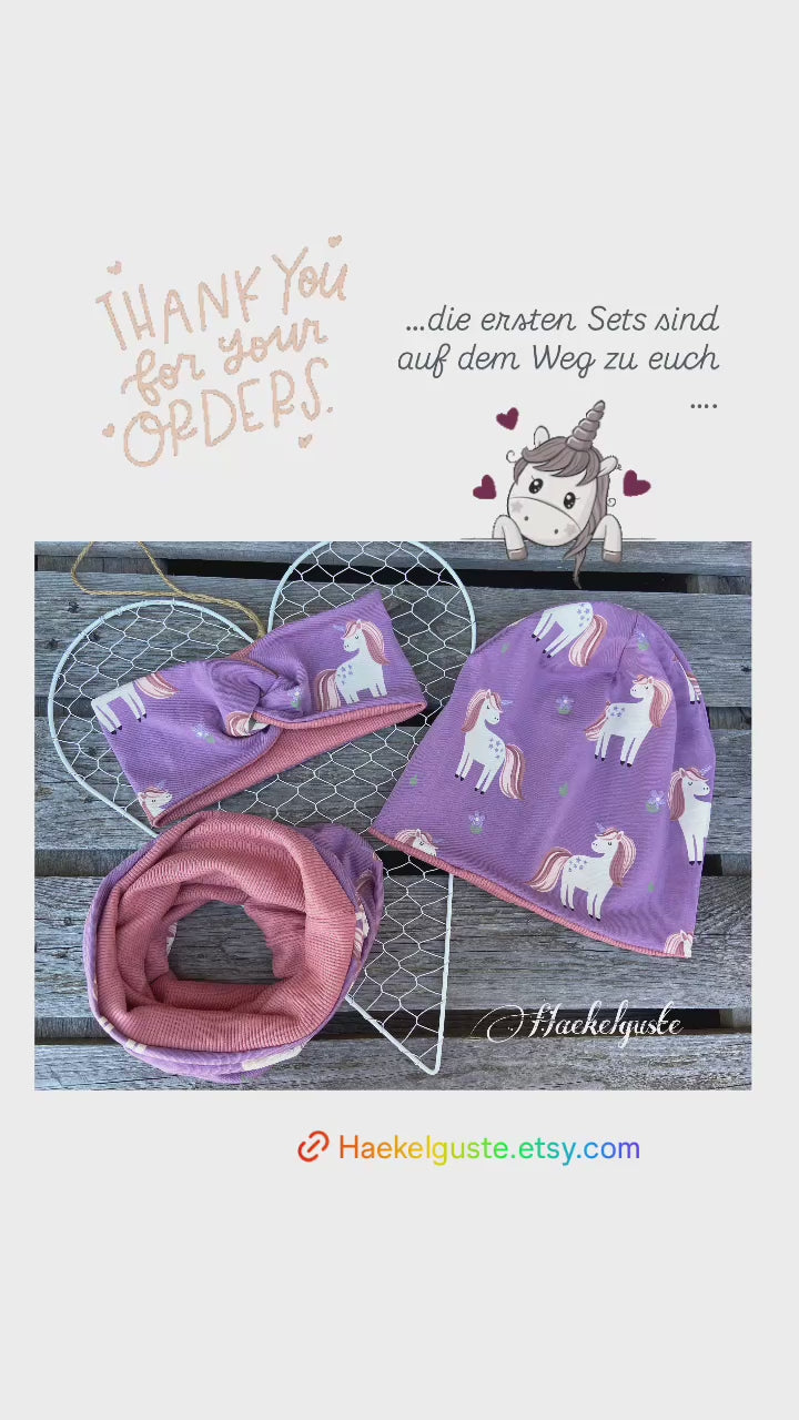 Mit viel Herz und Freude werden diese kleinen Mützen , Loop´s und Stirnbänder aus weichem hochwertigem Jersey mit Einhorn Motiv in gewünschter Größe angefertigt.