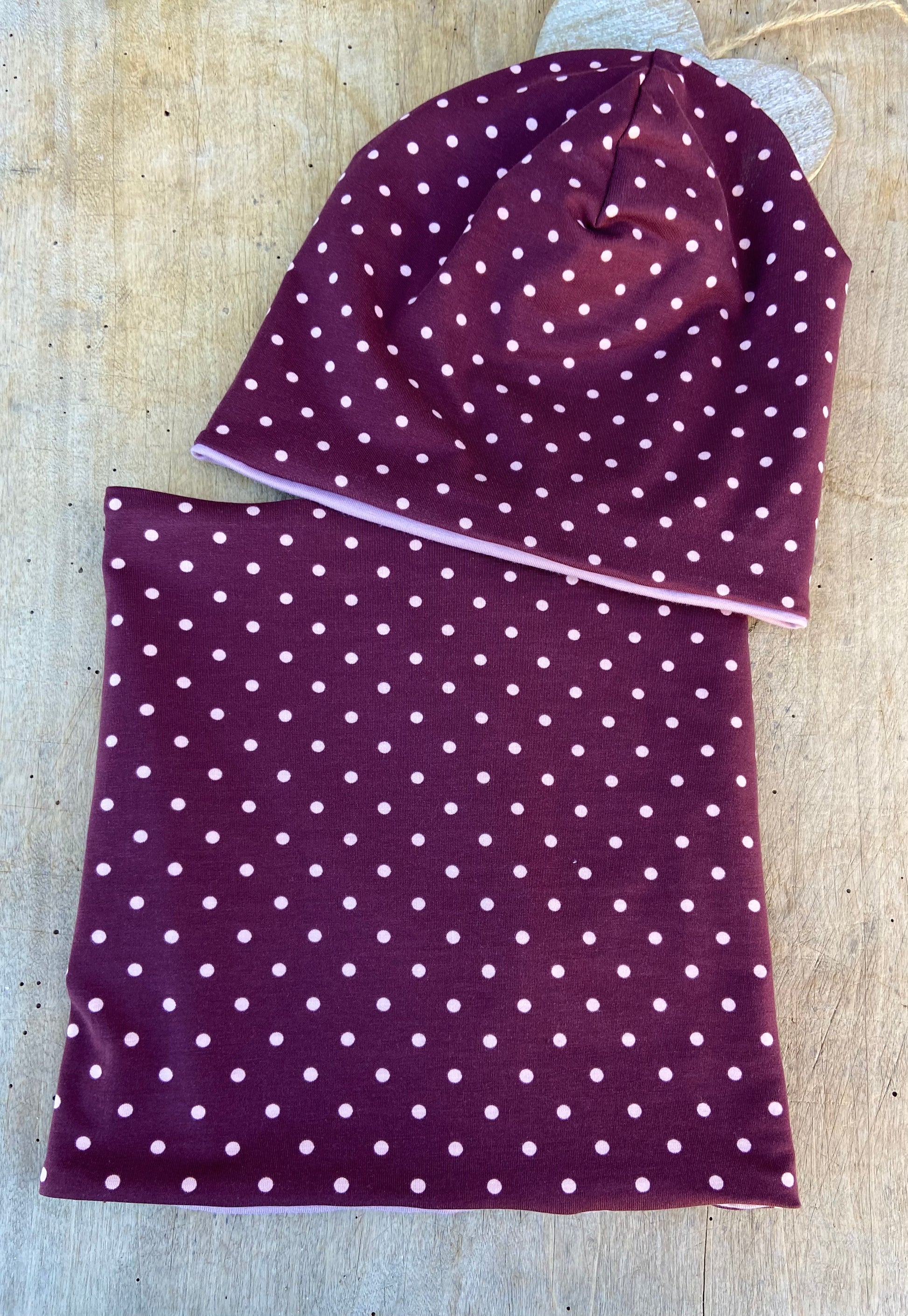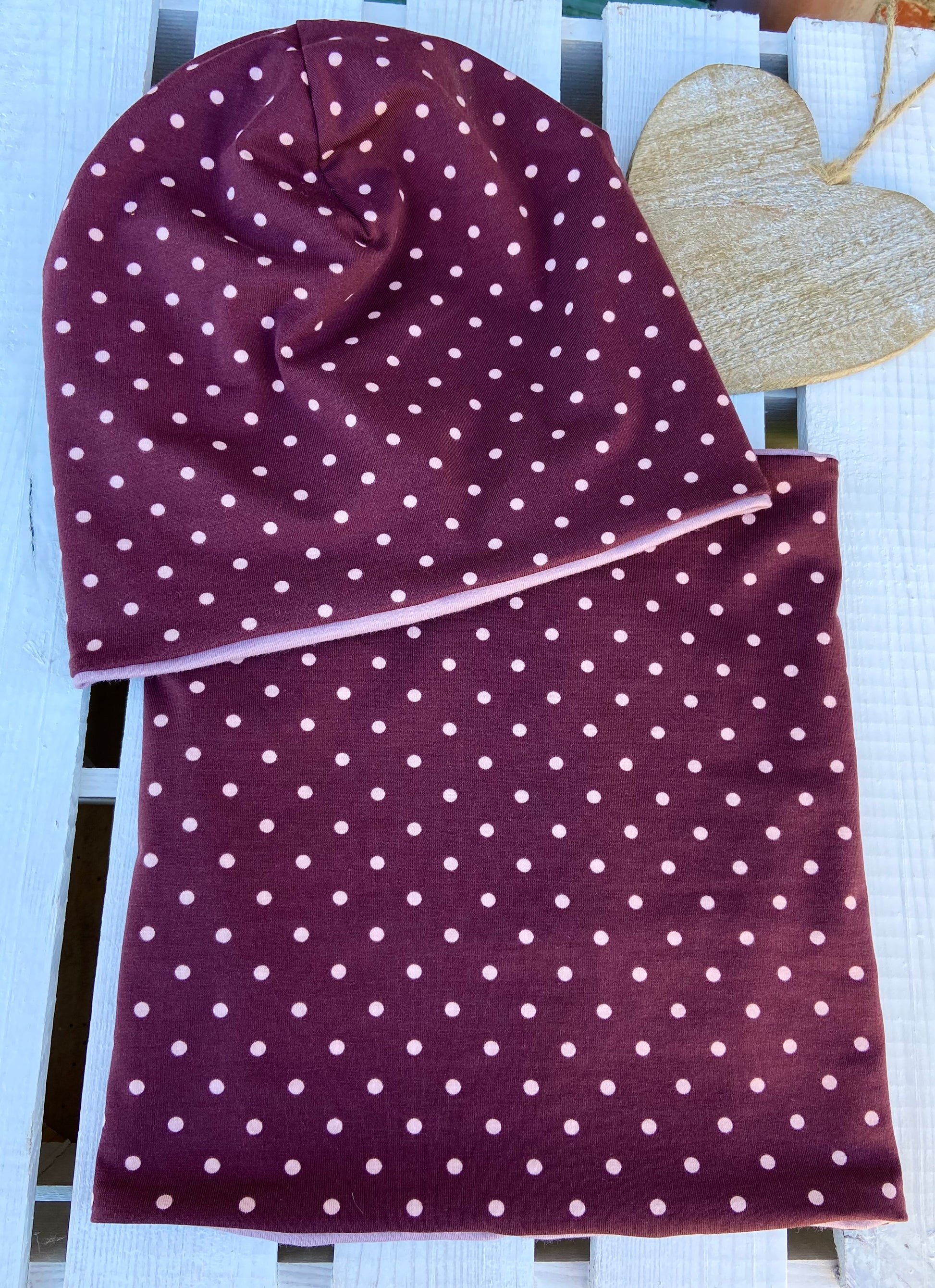 Mit viel Herz und Freude wird dieses kleine Set ( Loop und Mütze ) aus weichem hochwertigem Jersey mit Pünktchen Motiv in gewünschter Größe angefertigt. Beanie und Loop - innen mit Jersey in rosa und wahlweise gefüttert mit hellem Fleece in creme....