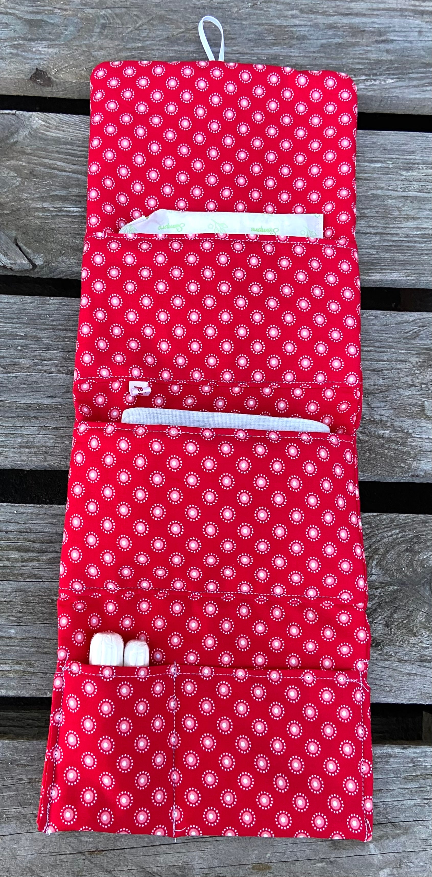 Meine Mädchen brachten mich auf diese Idee.... Alles was Sie unterwegs im Notfall brauchen passt in diese türkis-blaue PunkteTasche.... Innen ist eine kleine Tasche im Sterne Motiv - siehe Bilder !!! Platz für Wechsel-Slip , Binden , Tampons und eine kleine Tüte ....alles in einer unauffälligen Tasche verstaut und immer Griffbereit . Passt in jeden Schulrucksack , Sporttasche , Handtasche e.t.c. und kann an dem kleinen Gummiband gut an einem Handtuchhaken oder der Türklinke angehangen werden ... so sind die Hände frei und man muss das Täschchen nicht irgendwo unhygienisch ablegen