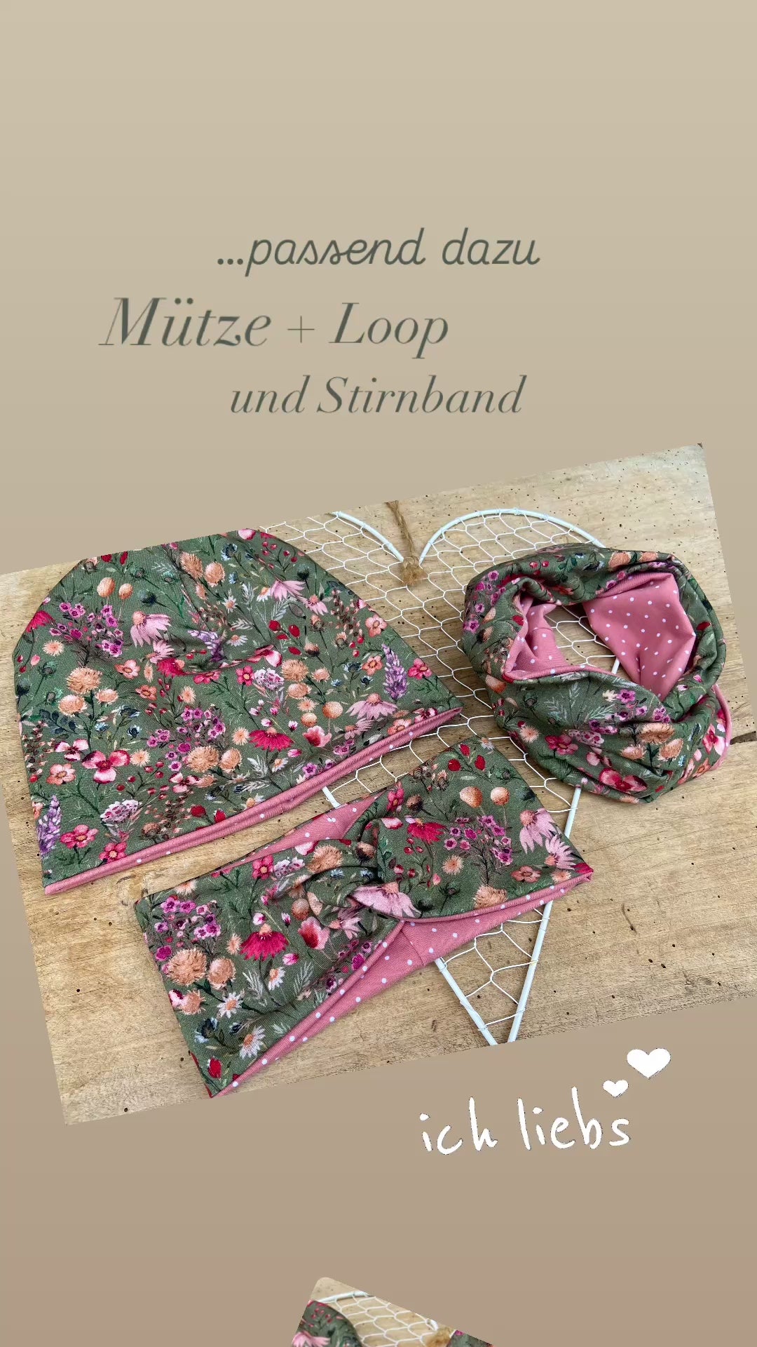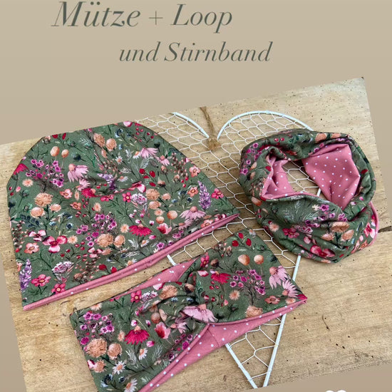 Eine Blümchen Mütze mit passendem Loop und Stirnband wird mit viel Herz und Freude in deiner gewünschten Größe angefertigt.