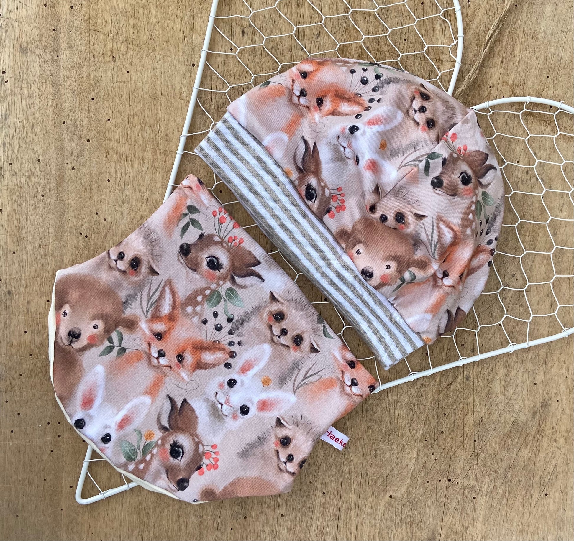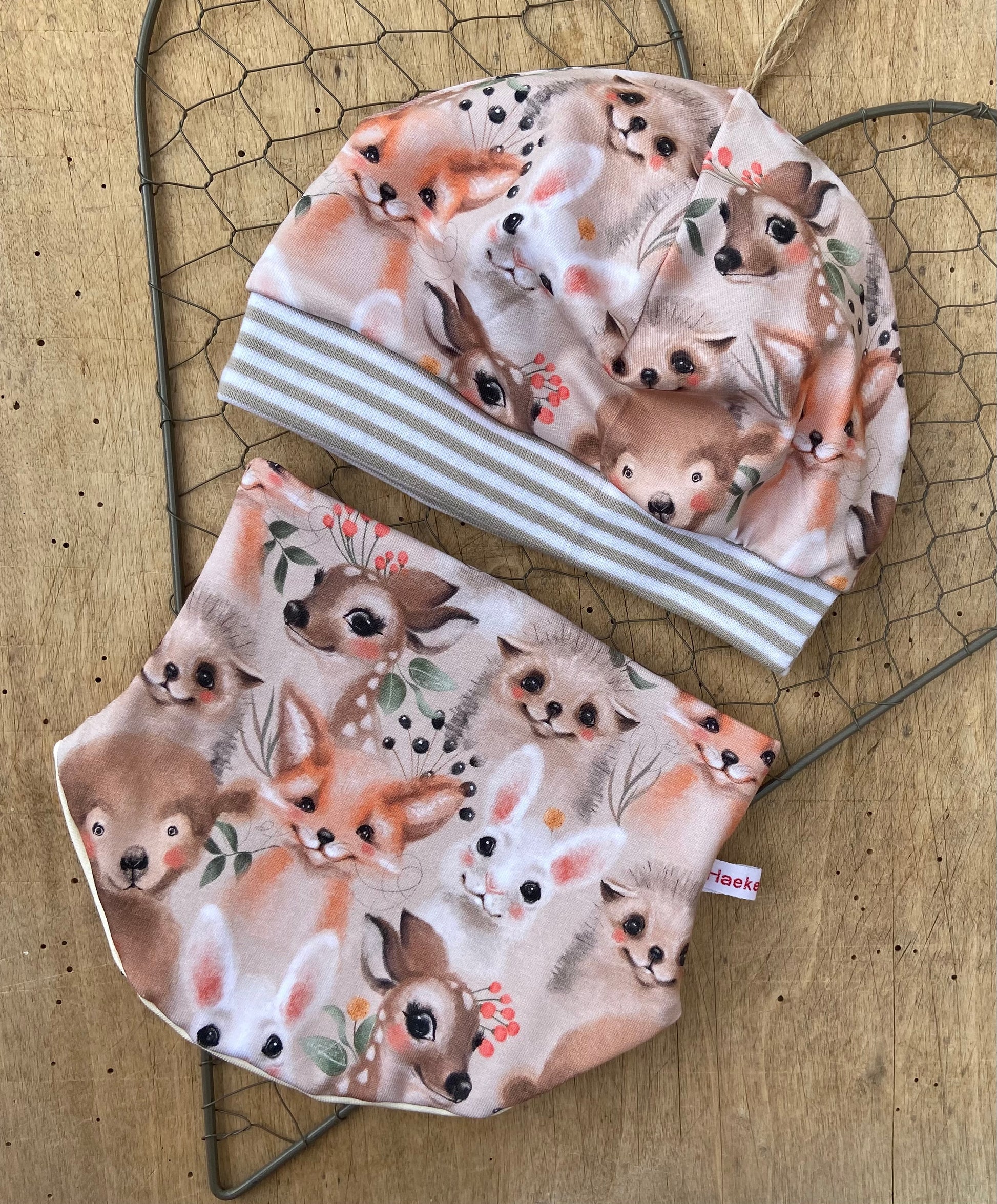 Mütze" Tiergesichter " Halssocke Kinder Beanie mit Bündchen Waldtiere Fuchs Reh beige Jersey Mädchen