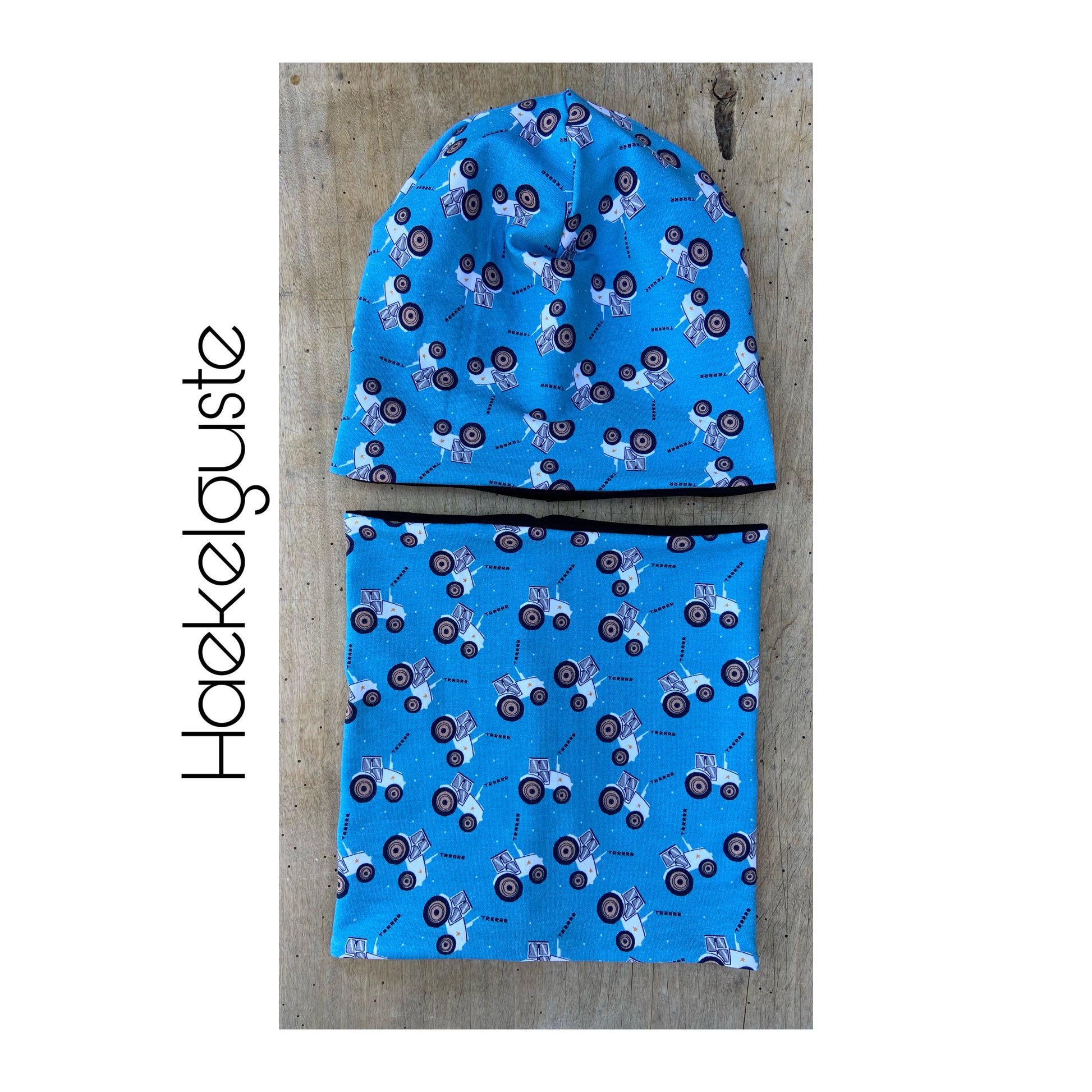 Mit viel Herz und Freude wird diese kleine Mütze aus weichem hochwertigem Jersey mit Traktor Motiven und Innenseite schwarz in gewünschter Größe angefertigt.